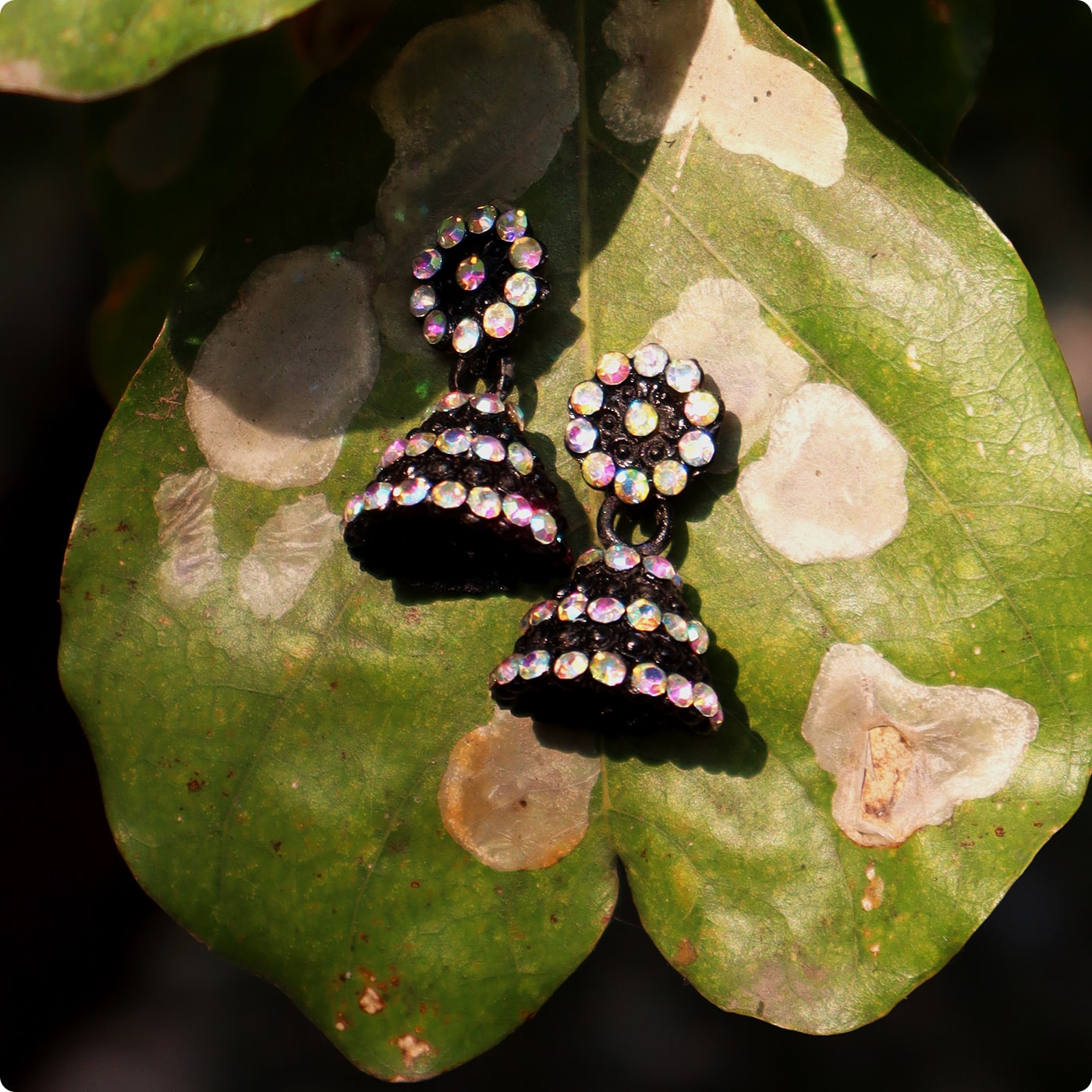 These exquisite handcrafted Jhumka earrings feature a stunning black base with sparkling crystal stones, giving them a luxurious and eye-catching appeal. The unique contrast of black and shimmering embellishments makes them perfect for both traditional and modern outfits.