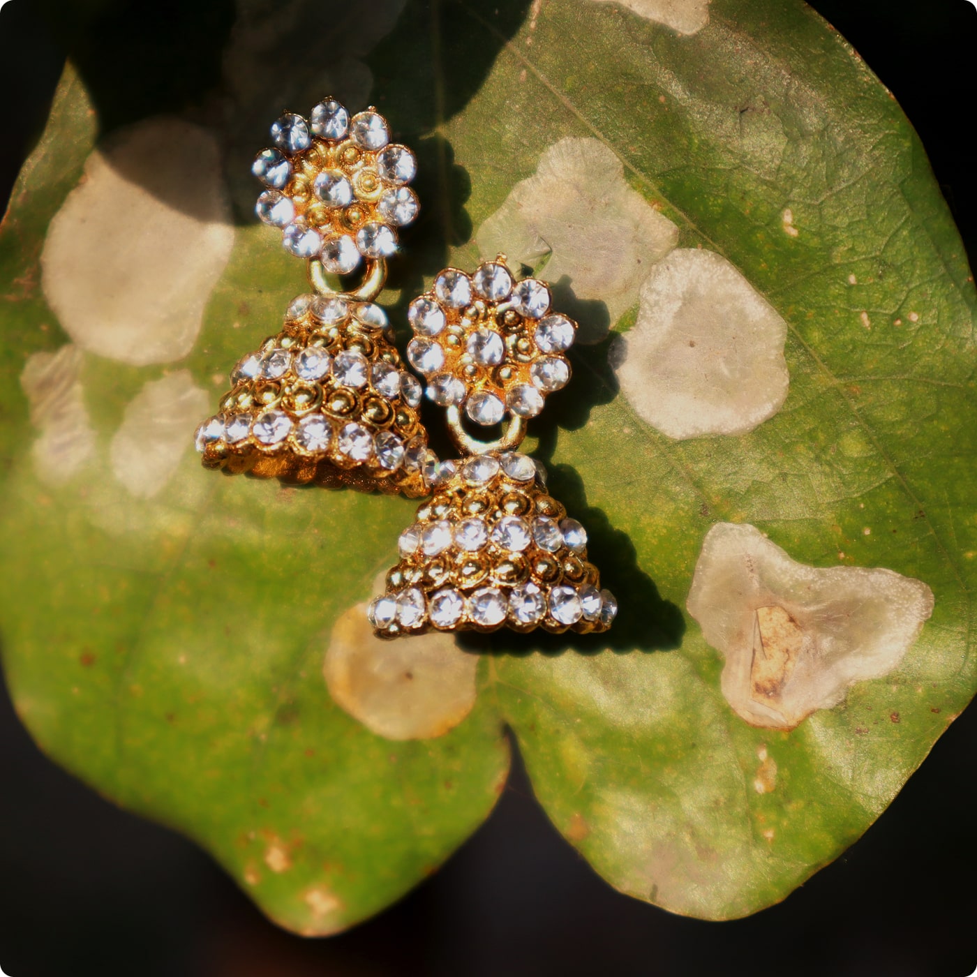 Radiant Gold Crystal Jhumka Earrings – Traditional Glamour